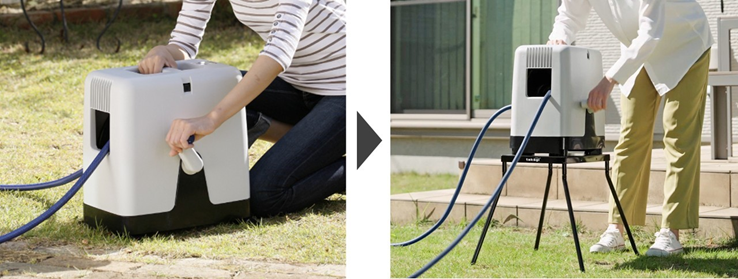 ホースリールは巻き取り時のかがむ姿勢が腰や膝への負担になるというお客様の声にお応えし、ハンドル位置を約40㎝高く出来る商品を新たに開発致しました。